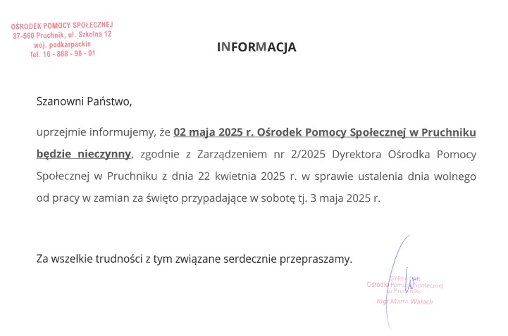 Dyrektor Ośrodka Pomocy Społecznej w Pruchniku informuje, że w dniach