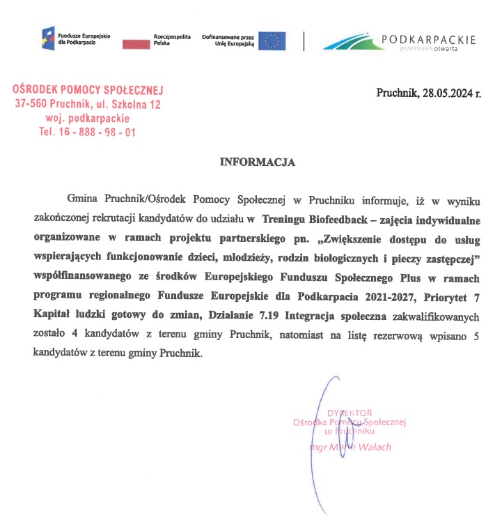 Dyrektor Ośrodka Pomocy Społecznej w Pruchniku ( ulica Szkolna 12 ) informuje, że od